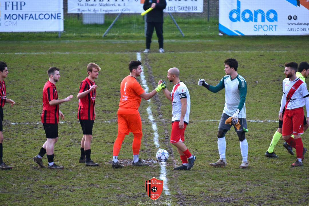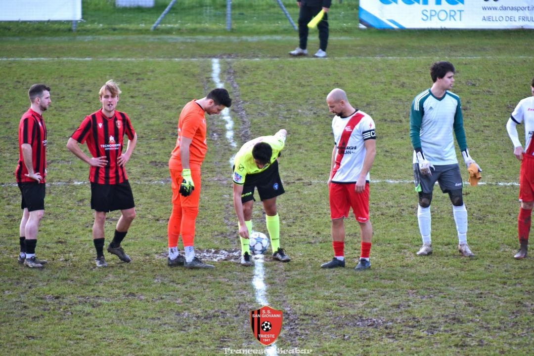 La ripresa, che vede un sensibile peggioramento del terreno di gioco, è ancora più brutta con le due squadre che si arrabattano a centrocampo in una sorta di calcio fiorentino. Al 52’ Marincich mette in mezzo per Andrea Vascotto che incorna bene il pallone obbligando Sandri ad un bel tuffo, è l’occasione più nitida per il Sangio della gara. Poi non succede nulla fino al 65’ quando il neoentrato Ferraioli calcia un tiraccio col mancino che termina lontanissimo dalla porta rossonera, cinque minuti dopo Forza ci prova con il mancino ma il portiere Sandri blocca il tiro centrale. Al 72’ arriva l’episodio decisivo del match: il neoentrato Franciosi prende palla, cerca un dai e vai con Ferraioli e poi calcia un tiro a giro che leva le ragnatele dall’incrocio alla sinistra di Aiello, 1 a 0 Bisiaca. Di fatto la partita finisce qui perché la squadra di Caiffa colleziona solo qualche mischia su calcio piazzato fino al 93’ quando, su cross di Crozzoli, Cuzzolin sul secondo palo insacca quasi involontariamente colpendo il cuoio di stinco. È l’ultimo sussulto di una trasferta da archiviare al più presto.
