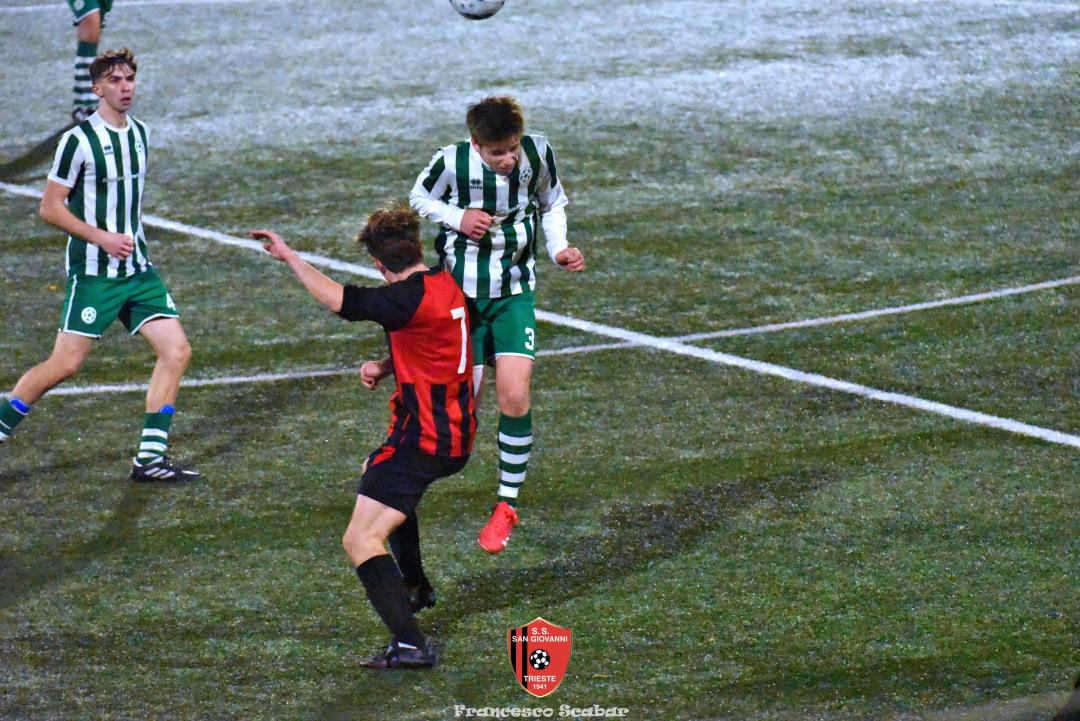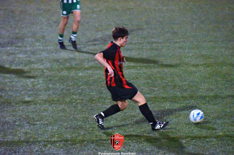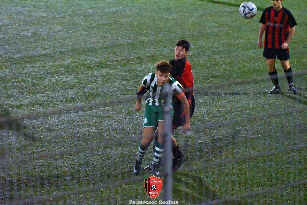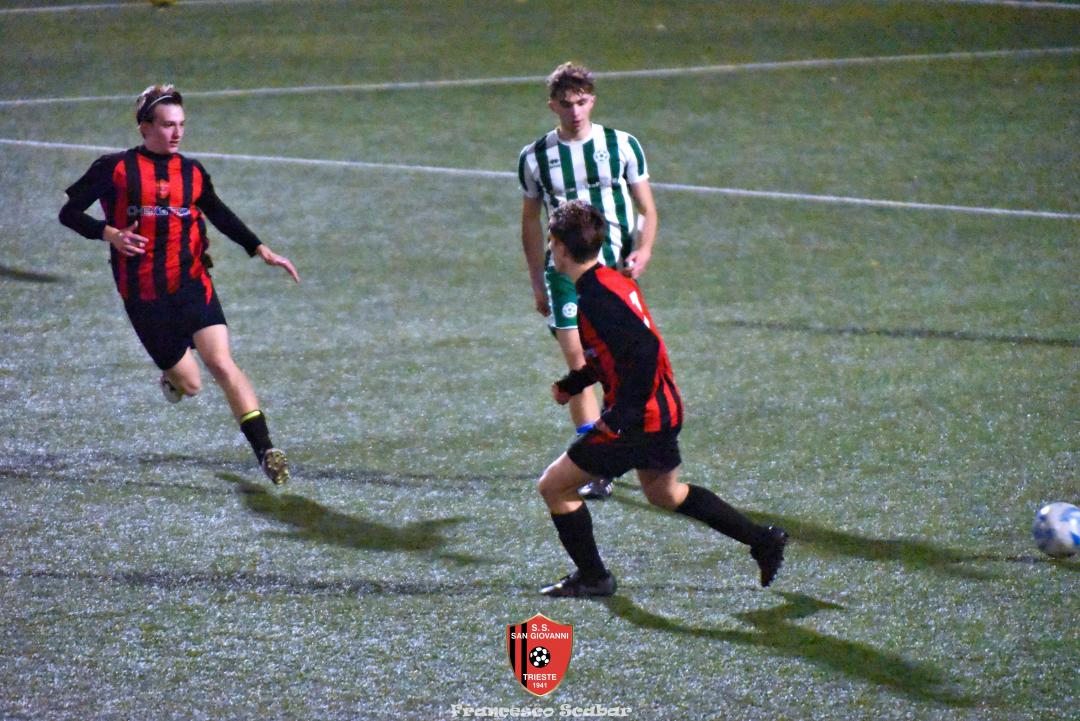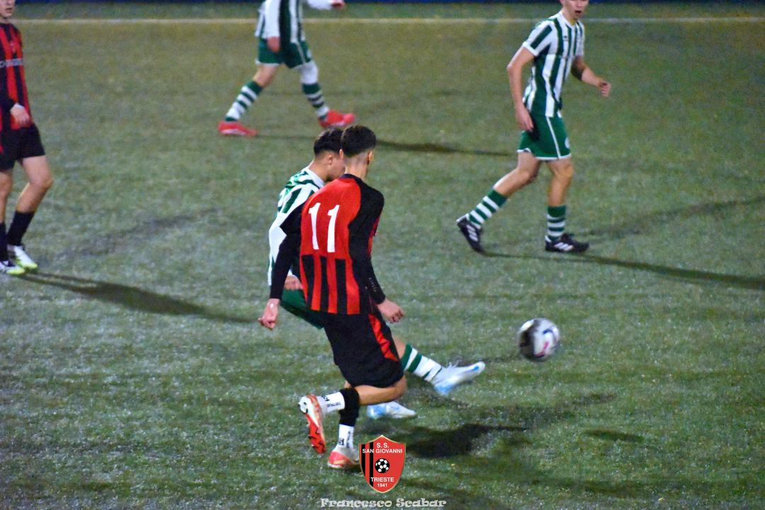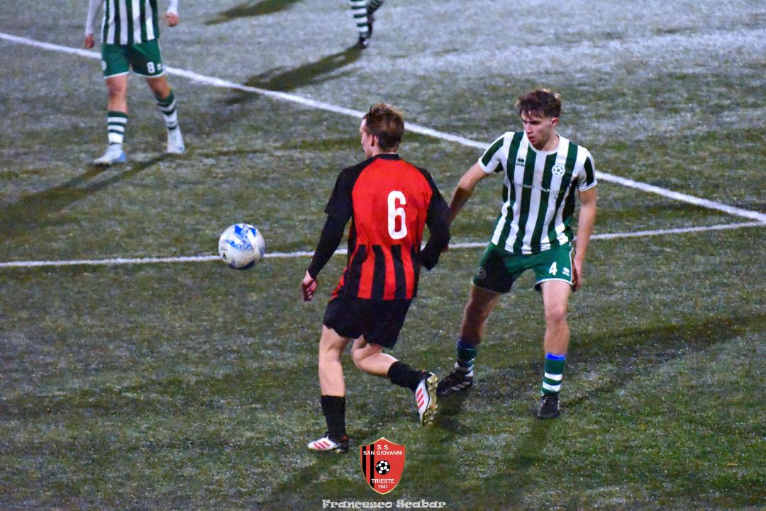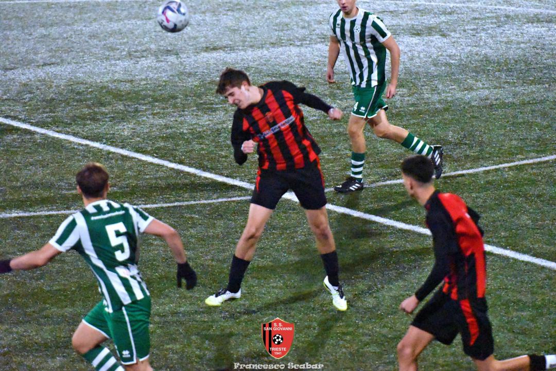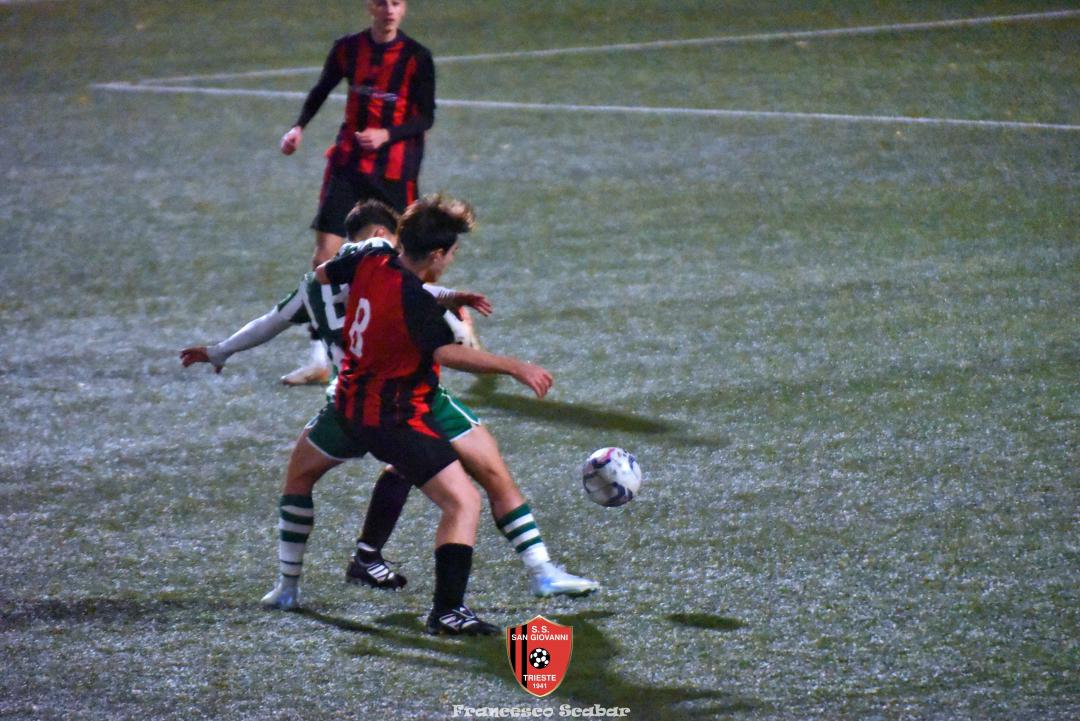 Mister De Castro per affrontare questa sfida conferma integralmente la formazione di Gorizia e dopo dieciotto secondi i suoi ragazzi alzano già le braccia: Camporeale con un gran tiro dalla trequarti coglie la traversa, il pallone rimbalza sulla riga (probabilmente già aldilà) e torna in campo ma arriva lo scatenato Alushani che segna da pochi passi l’1 a 0. Avanti di un gol il Sangio controlla i ritmi della gara pasticciando però in fase di costruzione, il Domio contiene bene le iniziative, piuttosto velleitarie dei padroni di casa e così bisogna aspettare il 25’ per vedere il raddoppio: Alushani scappa in contropiede (probabilmente in posizione irregolare) e fredda Sergi in uscita per il 2 a 0. Al 33’ lo scatenato Tedi calcia un tiro-cross insidioso che scheggia la traversa biancoverde ma il Domio reagisce un minuto dopo con un tiro che termina alto di Shabani. Al 39’ su cross di D’Introno, Piselli calcia di sinistro a lato facendo le prove generali del tris, un minuto dopo infatti Alushani segna il 3 a 0 raccogliendo un pallone vagante in area, scartando il portiere Sergi e depositando il cuoio in fondo al sacco. In chiusura della prima frazione D’Introno, su corner dalla destra di Camporeale, sfiora il poker mandando la palla di testa sopra alla traversa; il primo tempo si chiude così con un San Giovanni avanti (non del tutto meritatamente) di tre gol al cospetto di un Domio molto volitivo.