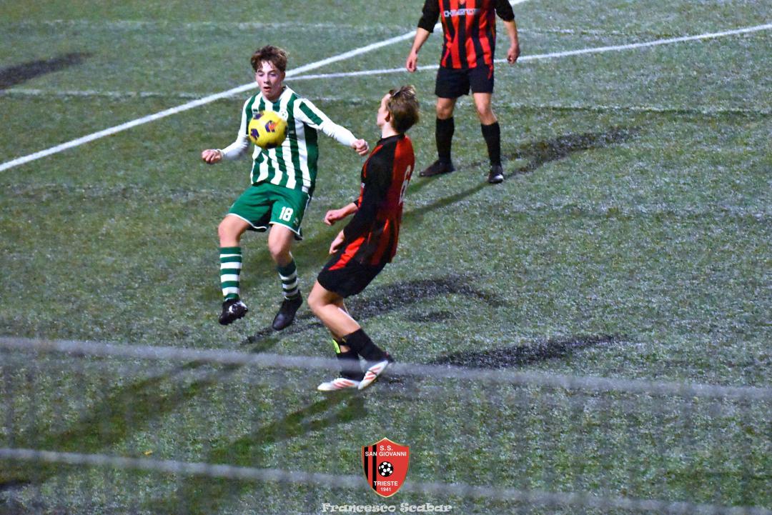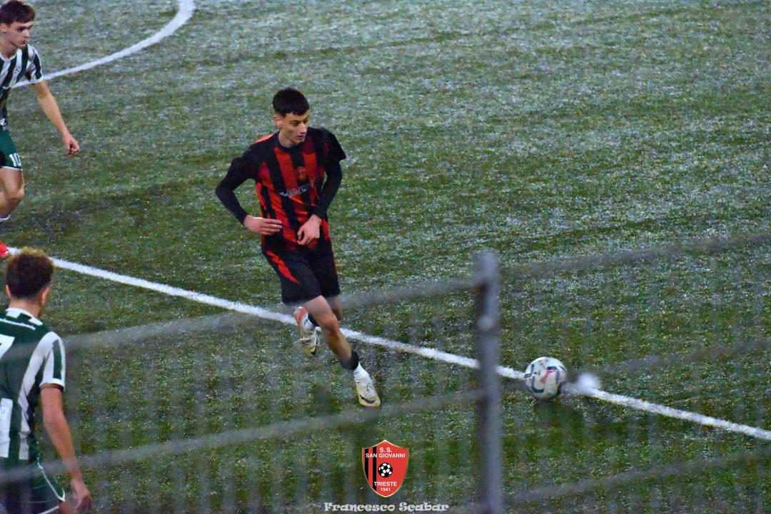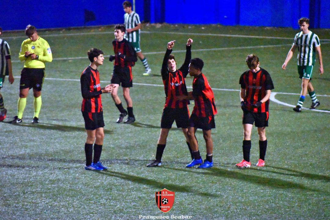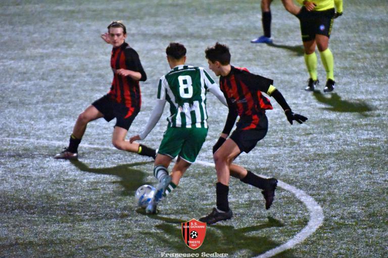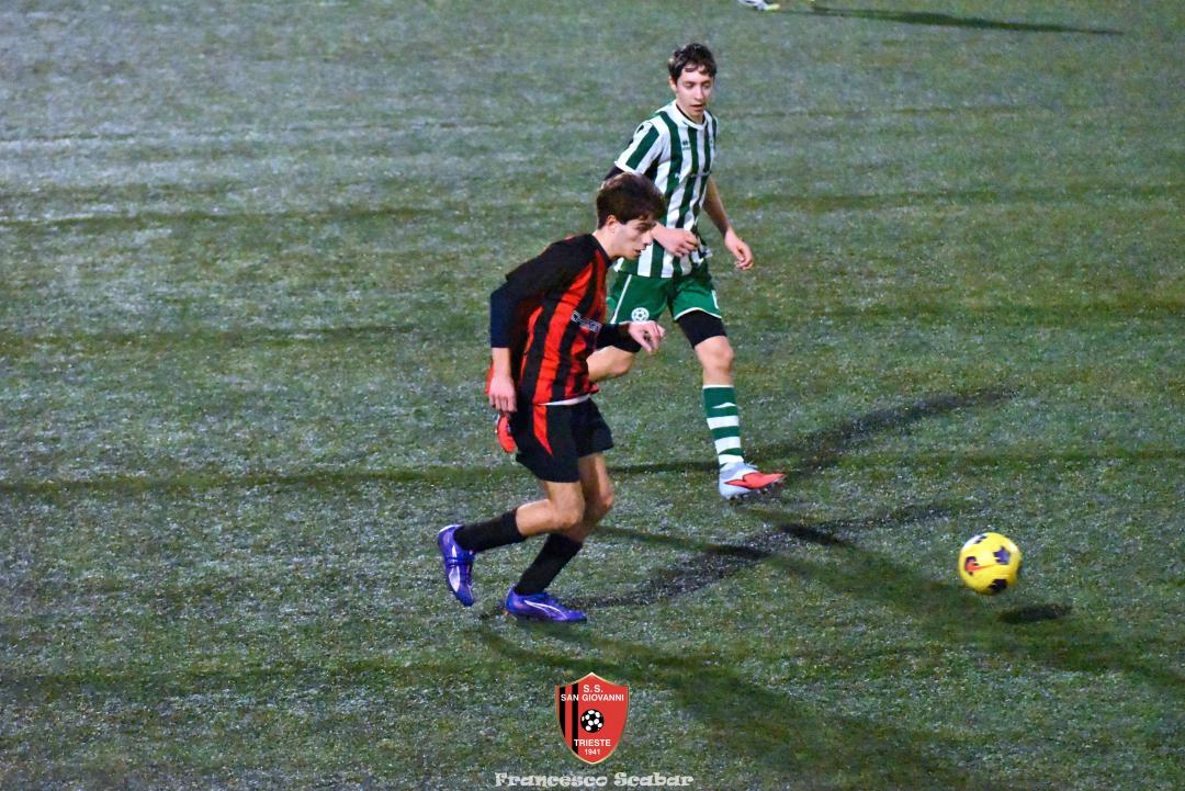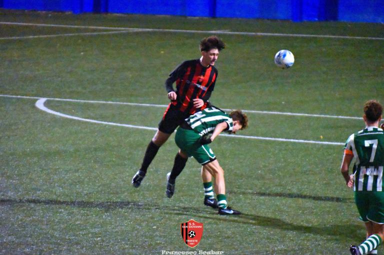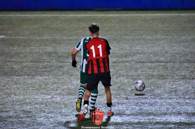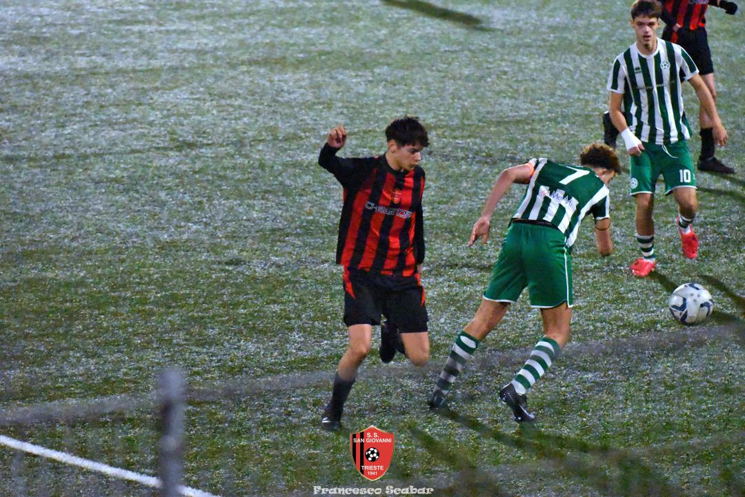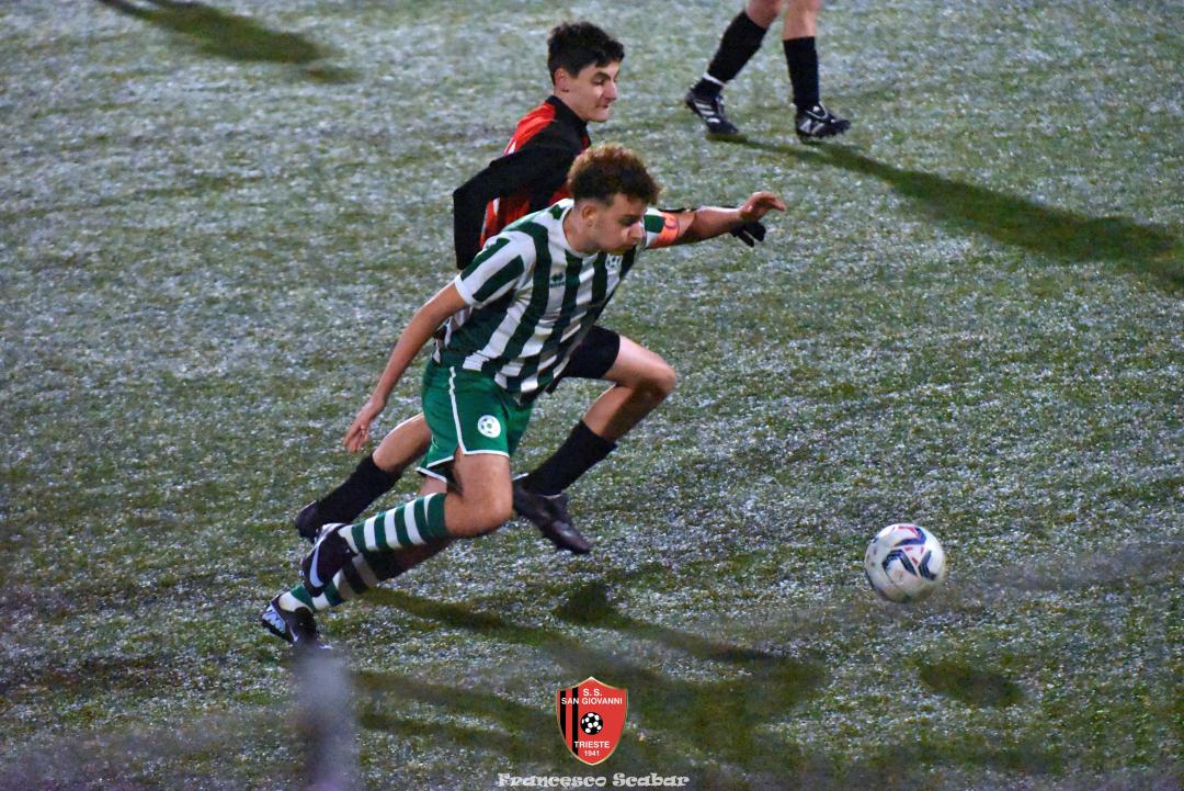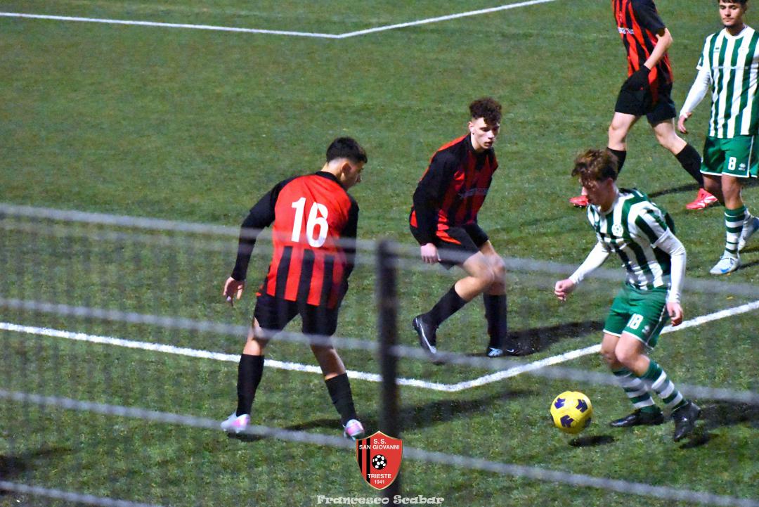 Mister De Castro per affrontare questa sfida conferma integralmente la formazione di Gorizia e dopo dieciotto secondi i suoi ragazzi alzano già le braccia: Camporeale con un gran tiro dalla trequarti coglie la traversa, il pallone rimbalza sulla riga (probabilmente già aldilà) e torna in campo ma arriva lo scatenato Alushani che segna da pochi passi l’1 a 0. Avanti di un gol il Sangio controlla i ritmi della gara pasticciando però in fase di costruzione, il Domio contiene bene le iniziative, piuttosto velleitarie dei padroni di casa e così bisogna aspettare il 25’ per vedere il raddoppio: Alushani scappa in contropiede (probabilmente in posizione irregolare) e fredda Sergi in uscita per il 2 a 0. Al 33’ lo scatenato Tedi calcia un tiro-cross insidioso che scheggia la traversa biancoverde ma il Domio reagisce un minuto dopo con un tiro che termina alto di Shabani. Al 39’ su cross di D’Introno, Piselli calcia di sinistro a lato facendo le prove generali del tris, un minuto dopo infatti Alushani segna il 3 a 0 raccogliendo un pallone vagante in area, scartando il portiere Sergi e depositando il cuoio in fondo al sacco. In chiusura della prima frazione D’Introno, su corner dalla destra di Camporeale, sfiora il poker mandando la palla di testa sopra alla traversa; il primo tempo si chiude così con un San Giovanni avanti (non del tutto meritatamente) di tre gol al cospetto di un Domio molto volitivo.