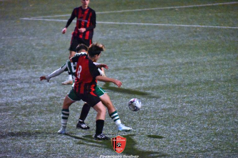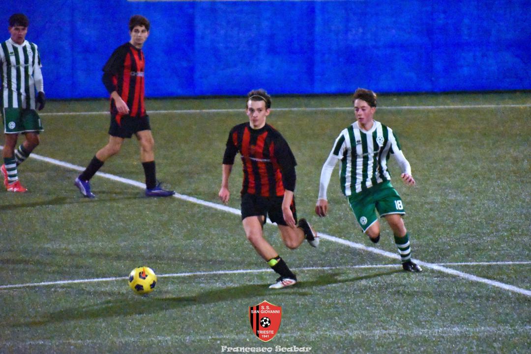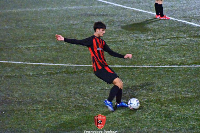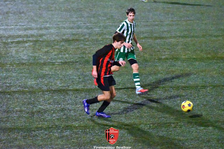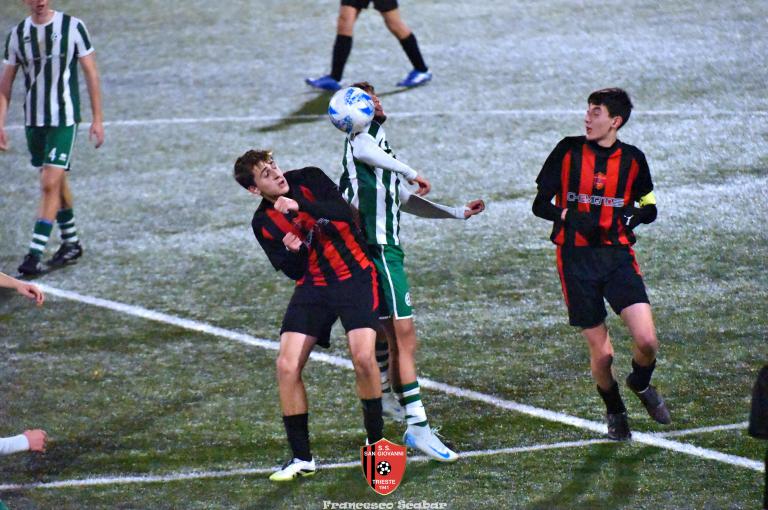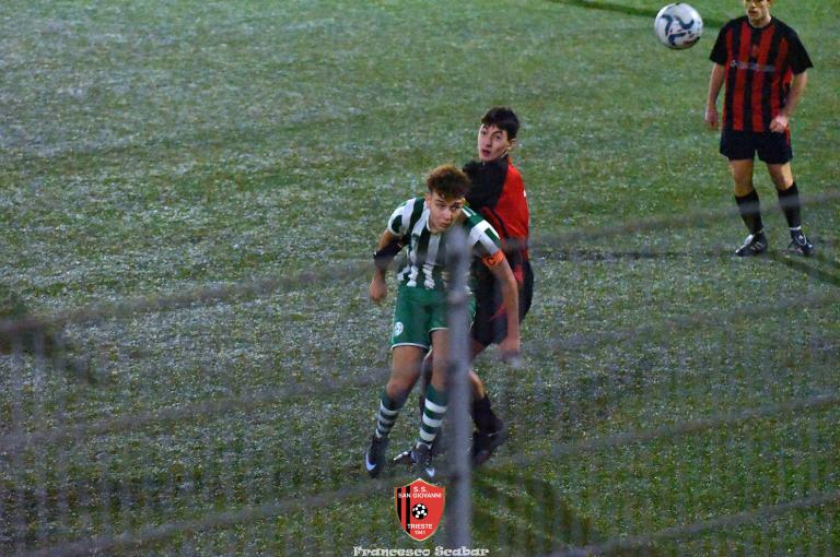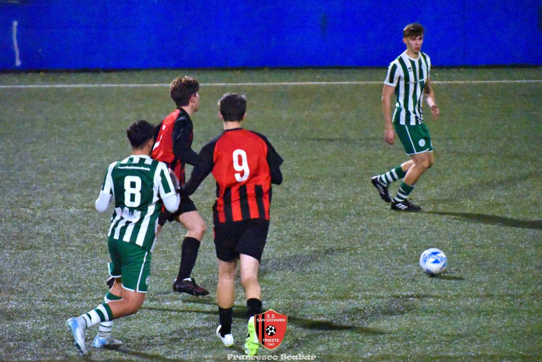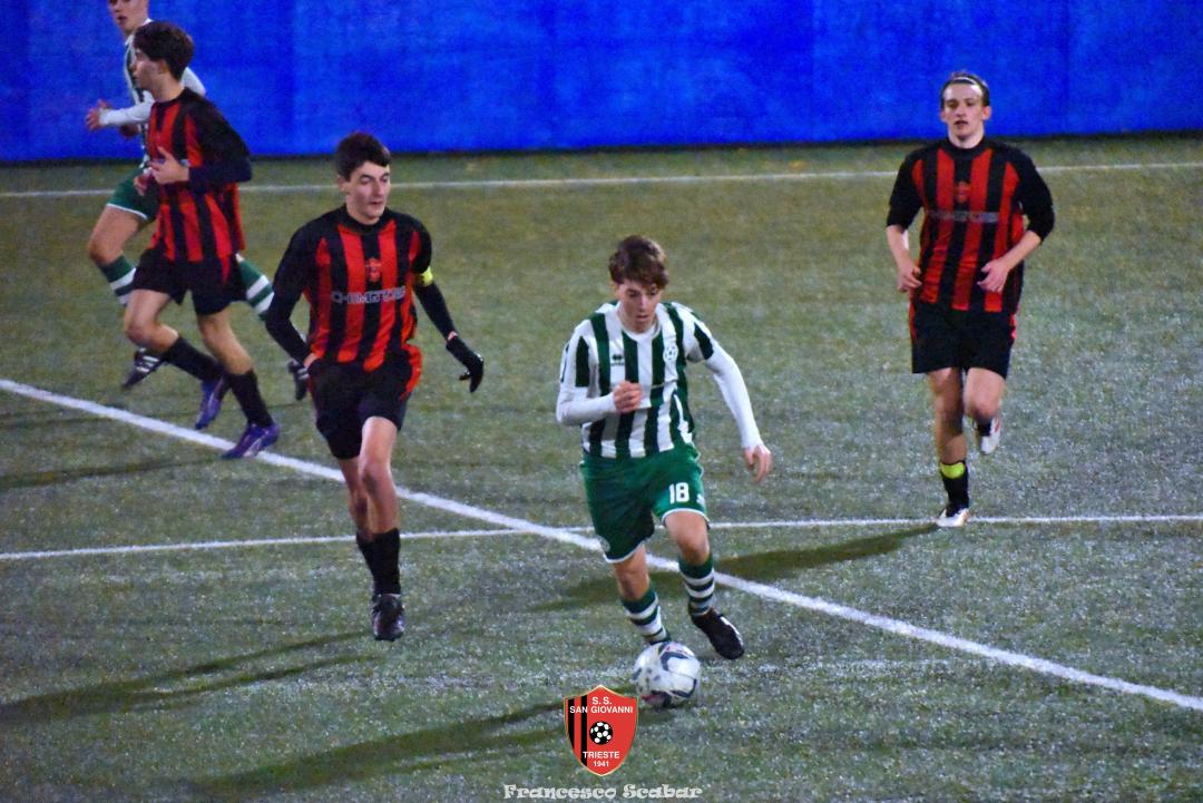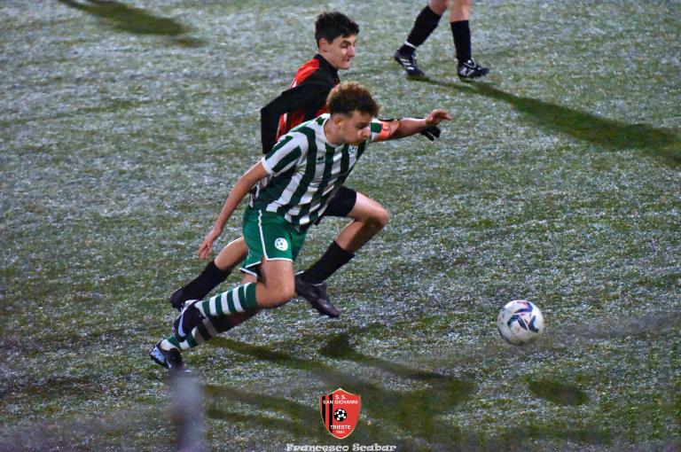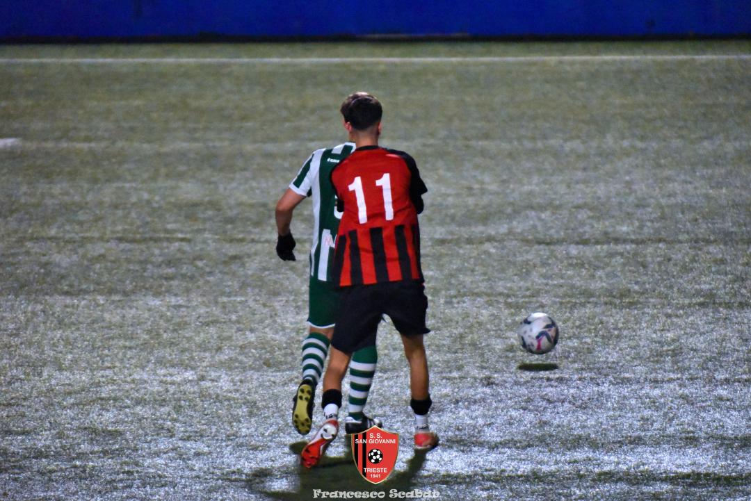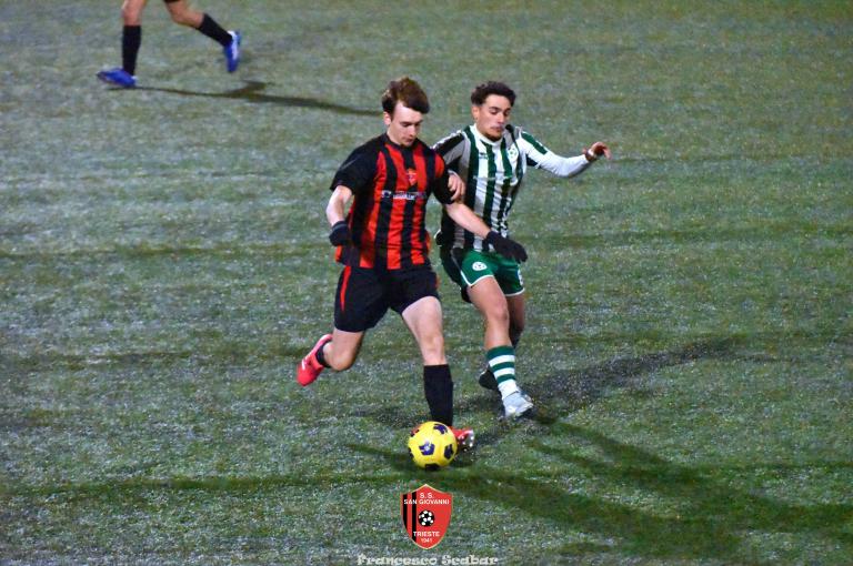 Mister De Castro per affrontare questa sfida conferma integralmente la formazione di Gorizia e dopo dieciotto secondi i suoi ragazzi alzano già le braccia: Camporeale con un gran tiro dalla trequarti coglie la traversa, il pallone rimbalza sulla riga (probabilmente già aldilà) e torna in campo ma arriva lo scatenato Alushani che segna da pochi passi l’1 a 0. Avanti di un gol il Sangio controlla i ritmi della gara pasticciando però in fase di costruzione, il Domio contiene bene le iniziative, piuttosto velleitarie dei padroni di casa e così bisogna aspettare il 25’ per vedere il raddoppio: Alushani scappa in contropiede (probabilmente in posizione irregolare) e fredda Sergi in uscita per il 2 a 0. Al 33’ lo scatenato Tedi calcia un tiro-cross insidioso che scheggia la traversa biancoverde ma il Domio reagisce un minuto dopo con un tiro che termina alto di Shabani. Al 39’ su cross di D’Introno, Piselli calcia di sinistro a lato facendo le prove generali del tris, un minuto dopo infatti Alushani segna il 3 a 0 raccogliendo un pallone vagante in area, scartando il portiere Sergi e depositando il cuoio in fondo al sacco. In chiusura della prima frazione D’Introno, su corner dalla destra di Camporeale, sfiora il poker mandando la palla di testa sopra alla traversa; il primo tempo si chiude così con un San Giovanni avanti (non del tutto meritatamente) di tre gol al cospetto di un Domio molto volitivo.