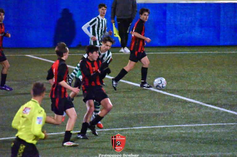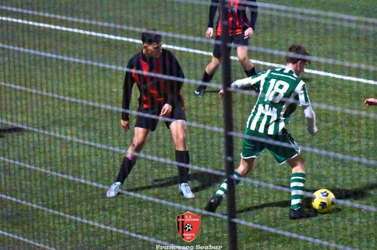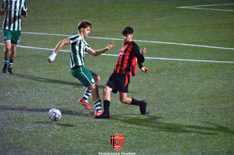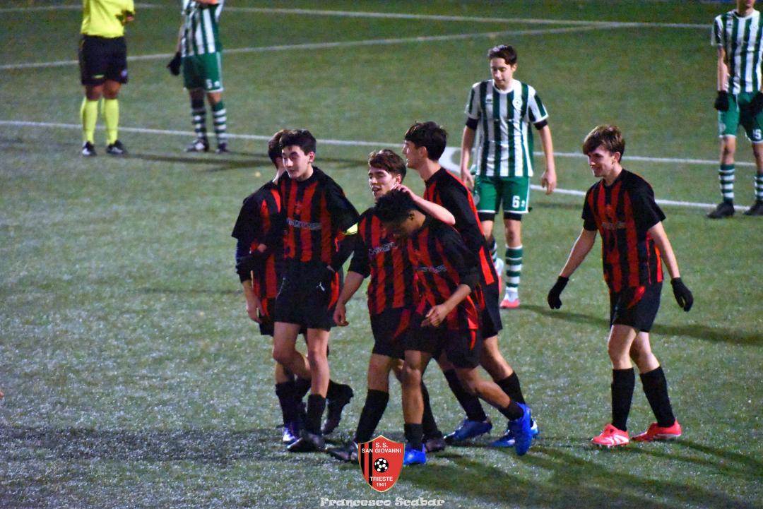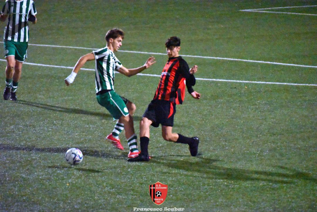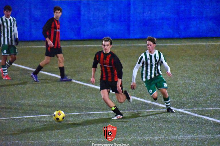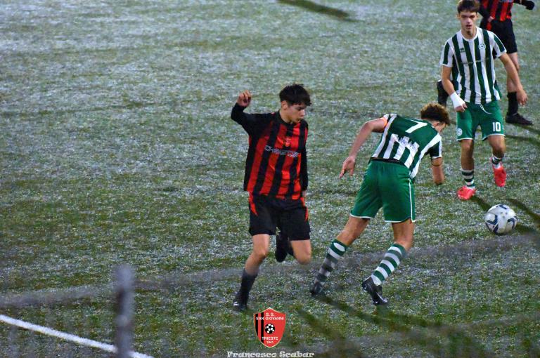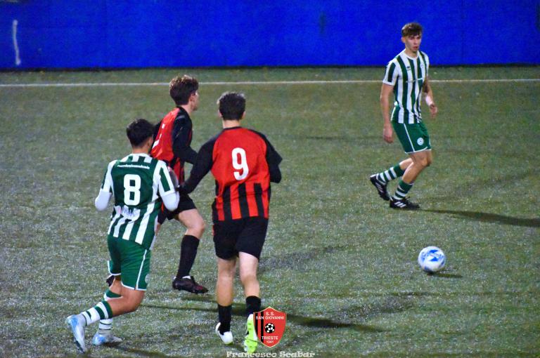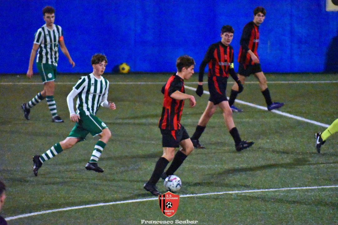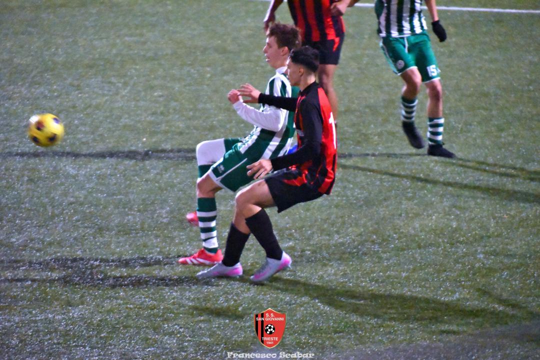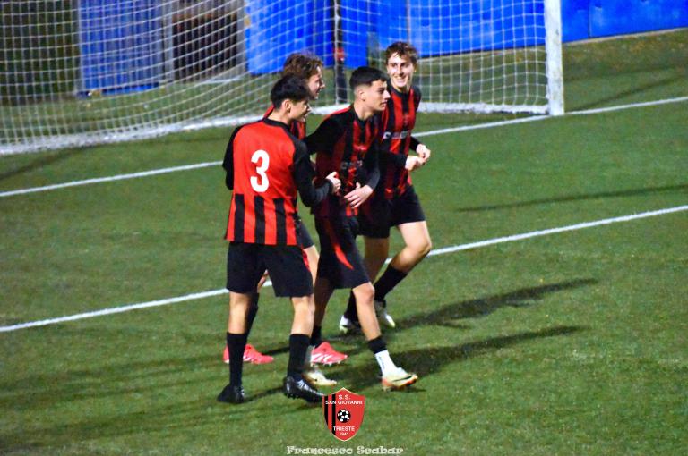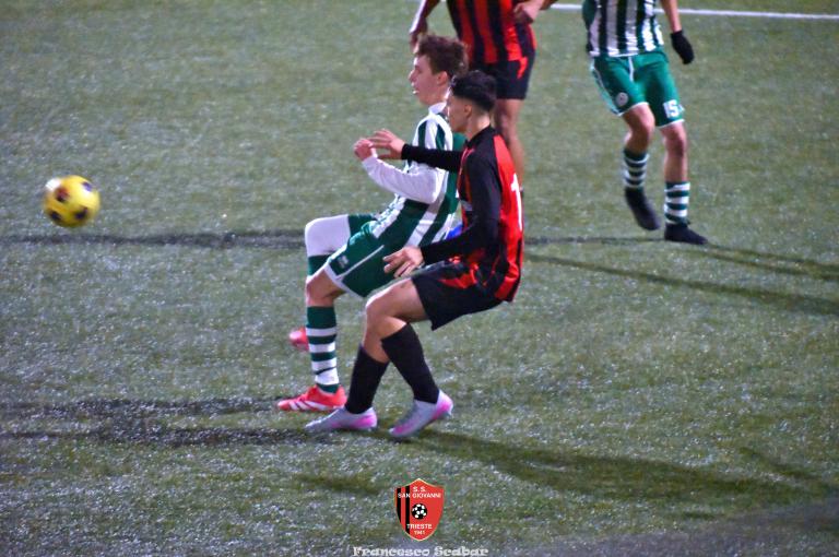 Mister De Castro per affrontare questa sfida conferma integralmente la formazione di Gorizia e dopo dieciotto secondi i suoi ragazzi alzano già le braccia: Camporeale con un gran tiro dalla trequarti coglie la traversa, il pallone rimbalza sulla riga (probabilmente già aldilà) e torna in campo ma arriva lo scatenato Alushani che segna da pochi passi l’1 a 0. Avanti di un gol il Sangio controlla i ritmi della gara pasticciando però in fase di costruzione, il Domio contiene bene le iniziative, piuttosto velleitarie dei padroni di casa e così bisogna aspettare il 25’ per vedere il raddoppio: Alushani scappa in contropiede (probabilmente in posizione irregolare) e fredda Sergi in uscita per il 2 a 0. Al 33’ lo scatenato Tedi calcia un tiro-cross insidioso che scheggia la traversa biancoverde ma il Domio reagisce un minuto dopo con un tiro che termina alto di Shabani. Al 39’ su cross di D’Introno, Piselli calcia di sinistro a lato facendo le prove generali del tris, un minuto dopo infatti Alushani segna il 3 a 0 raccogliendo un pallone vagante in area, scartando il portiere Sergi e depositando il cuoio in fondo al sacco. In chiusura della prima frazione D’Introno, su corner dalla destra di Camporeale, sfiora il poker mandando la palla di testa sopra alla traversa; il primo tempo si chiude così con un San Giovanni avanti (non del tutto meritatamente) di tre gol al cospetto di un Domio molto volitivo.