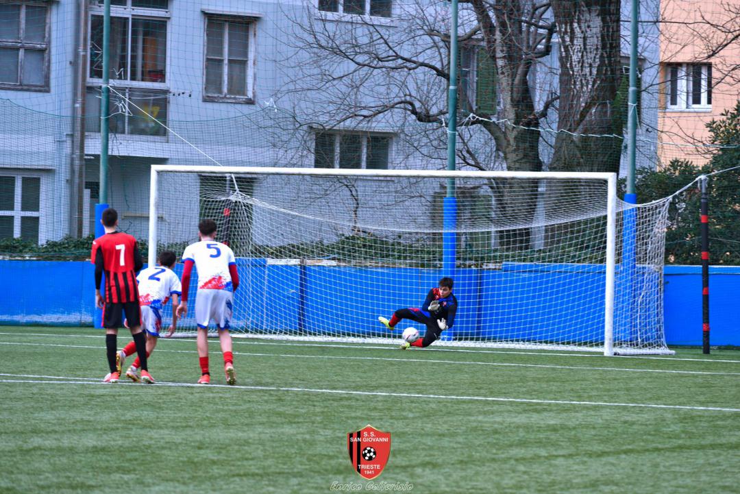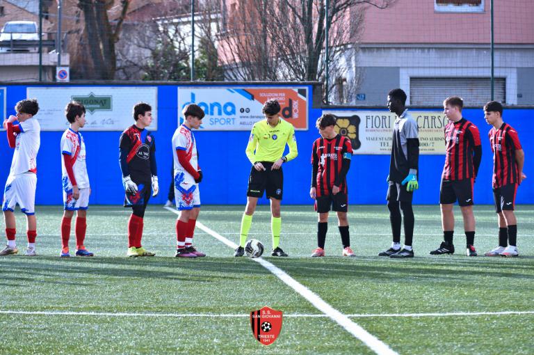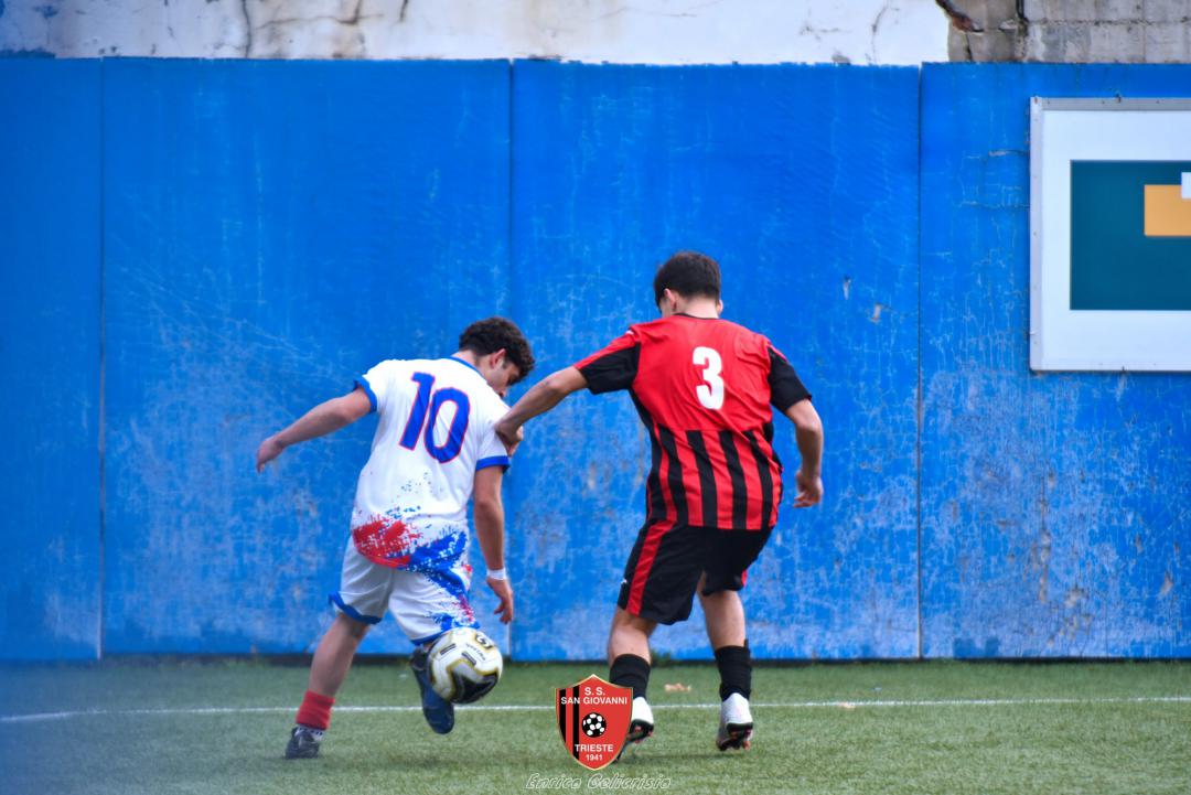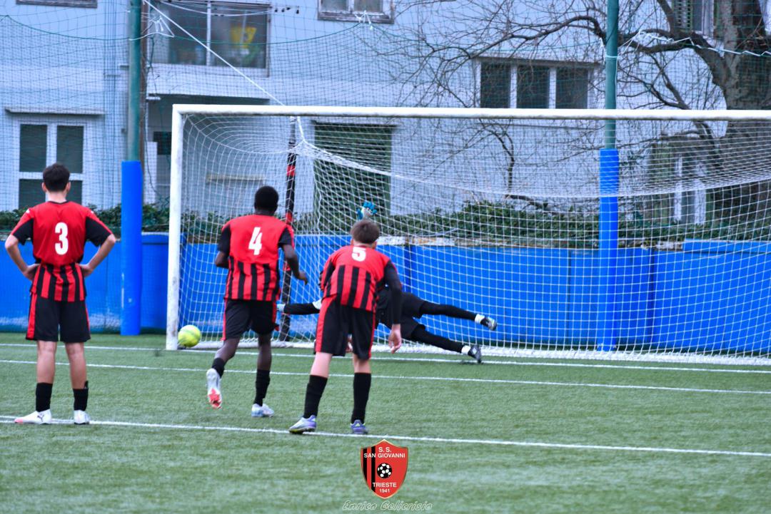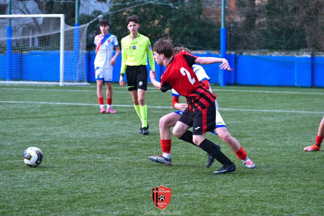 Per la seconda sfida del ritorno in casa i rossoneri si schierano con il 3-4-2-1 con Ndiaye a tuttafascia sulla sinistra e Triolo e Stocker dietro a Devescovi, in porta ritorna Tall. La partita è bloccata ed al 2’ si fa minacciosa la squadra avversaria: su una mischia la palla perviene a Rossetti che però calcia alto. Il Sangio imbriglia bene gli avversari e con il passare dei minuti inizia a pungere: al 12' un cross di Ndiaye trova Giurgevich sull’altro palo (da quinto a quinto) che però calcia alto, al quarto d’ora risponde l’Isontino con un tiro di Rossetti parato da Tall in presa, al 19' Stocker serve Ndiaye che però calcia debolmente fuori. Un minuto dopo ci riprova Stocker ma il portiere Visintin para il tiro dell’ungherese e sul ribaltamento di fronte una conclusione parabolica di Dizdarevic termina alta. Al 25' c’è occasionissima in mischia per i rossoneri con Slavez e Devescovi che non trovano l'attimo giusto per calciare a rete. Al 29' un fallo del portiere Visintin su Stocker causa un rigore, dal dischetto Ndiaye calcia piano ma Visintin si fa passare palla sotto la pancia ed il Sangio passa avanti 1 a 0. Al 32’ reagisce la compagine allenata da Blason con un tiro debole su punizione di Pasian che Tall para, quattro minuti dopo altro calcio piazzato, questa volta rossonero, con Lo che manda il pallone fuori di poco. Al 38’ però arriva il 2 a 0 del Sangio: sempre su calcio di punizione, Stocker indovina una parabola che sorprende il guardiano Visintin. Due minuti dopo ci riprova Stocker ma il suo tiro da fuori termina fuori. Al 43’, quando la squadra rossonera sembra in assoluto controllo del match, arriva la doccia fredda del 2 a 1: Marinaro sbaglia il tempo d’intervento in area e Milani, bomber dell’Isontino, non perdona battendo Tall da pochi passi. Il primo tempo si conclude così sul 2 a 1 per il San Giovanni.