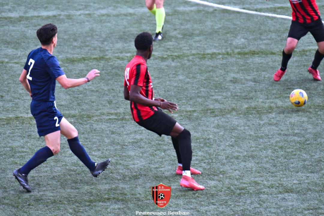 Veniamo alla cronaca della sfida: la prima occasione è rossonera al 4’ ma il sinistro potente di Sabadin finisce di poco fuori, due minuti più tardi un altro tiro da lontano, questa volta di Vouk termina alto sulla traversa. Al 9’ minuto, alla prima occasione come spesso succede alle grandi squadre, la Maranese passa in vantaggio: Kabine calcia una punizione perfida ed angolata dai trenta metri che sorprende Aiello sulla sua destra. Poi la squadra lagunare controlla le operazioni fino al 26’ quando il San Giovanni pareggia: Sabadin chiude un bel scambio con Lapaine e calcia a rete un tiro che sorprende Stanivuk, parso non impeccabile nel leggere la traiettoria del tiro, 1 a 1. Al 35’ occasionissima rossonera per il 2 a 1: Lapaine riceve un lungo lancio di Marincich ma da pochi metri calcia su Stanivuk che così si riscatta con un grande intervento di piede. Al 43’ però, Kabine punisce ancora una volta il Sangio con una bella percussione centrale conclusa con una sassata al fulmicotone sotto il sette, 2 a 1 Maranese e su questo risultato termina il primo tempo.