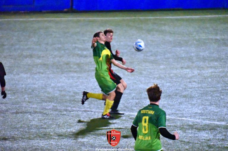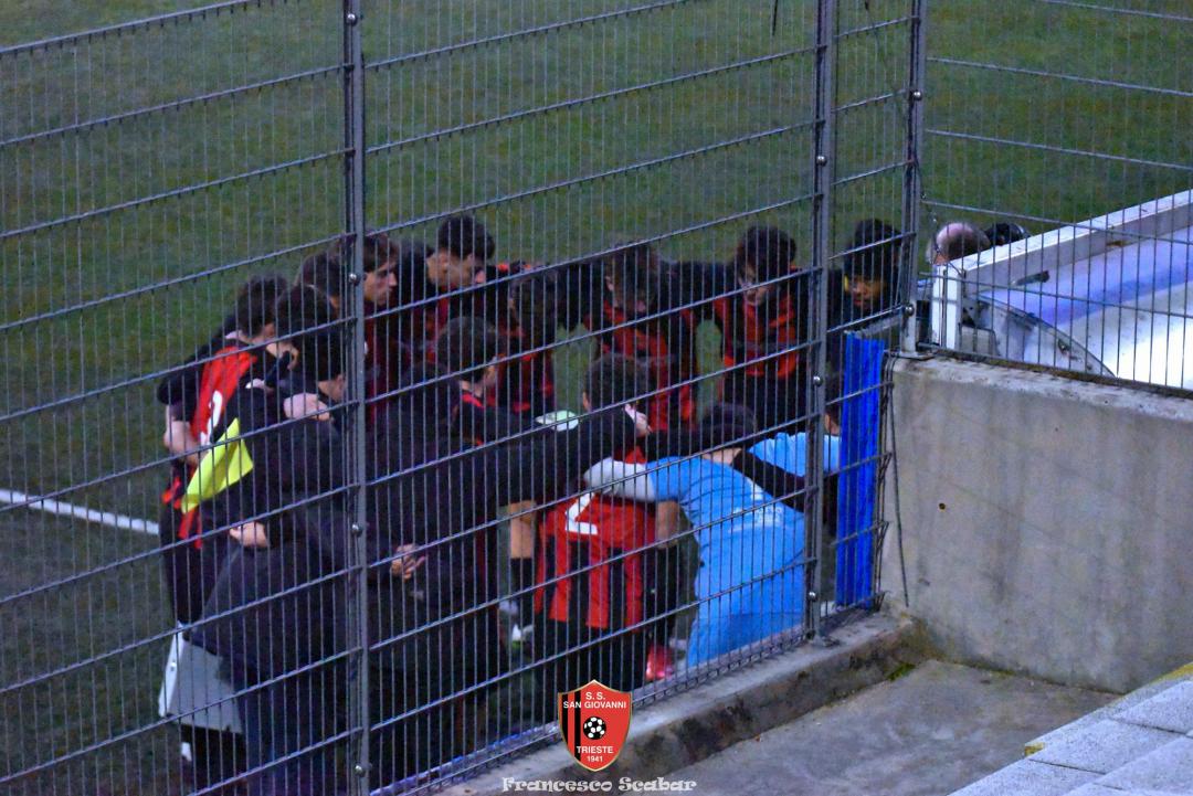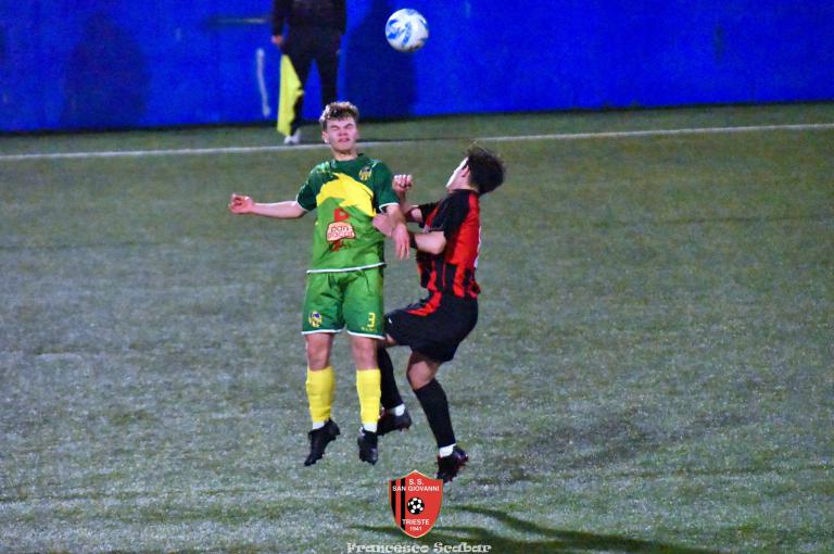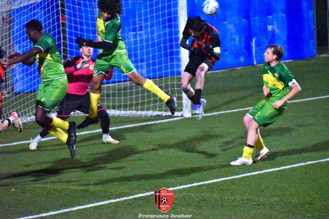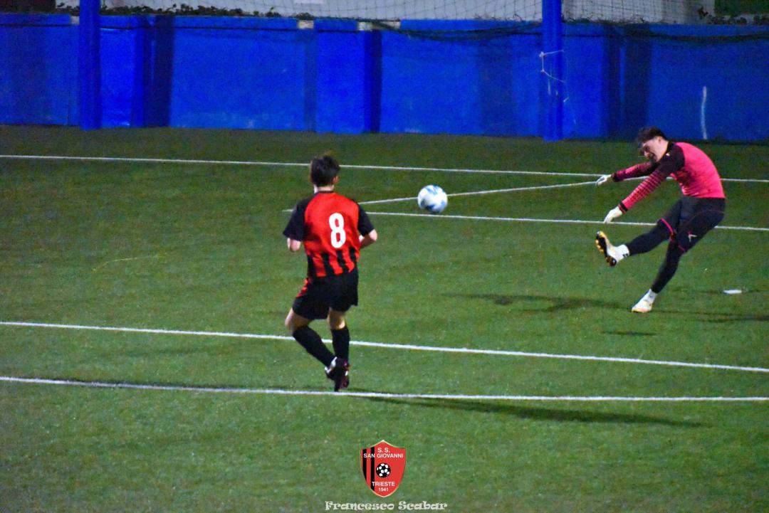 Il Sangio si schiera in partenza con il suo classico 4-4-2 con Camporeale e Flego che agiscono a “piedi invertiti” con “Campo” che parte a destra, davanti Kanidisek è la spalla del bomber Alushani, capocannoniere del campionato. Il Sistiana di mister Fuccio si schiera con una formazione molto aggressiva in mezzo e con un gioco molto diretto volto ad aggredire in mezzo e servire il più velocemente possibile le punte. Al sesto minuto si registra la prima occasione del match: Crevatin converge sul sinistro e calcia a rete, Stefanucci blocca. Risponde un minuto dopo Camporeale con un bel mancino che il portiere Blason abbranca in presa. Al dodicesimo però la squadra ospite passa inaspettatamente avanti: su un corner dalla destra Stefanucci esce in modo difettoso facendosi anticipare dalla testa del lungo Italiano che insacca così l’1 a 0. Il Sangio reagisce appena al quarto d’ora con un tiraccio di Venier che termina a lato, sessanta secondi dopo i delfini sfiorano il raddoppio con lo scatenato Crevatin che calcia dal limite un tiro che si spegne di poco sopra alla traversa. Al venticinquesimo ci prova Lapasin dai trentacinque metri ma la sua botta viene bloccata da Blason. Al 27’ però arriva, in modo del tutto casuale, il pari rossonero: Camporeale converge sul sinistro lasciando partire un cross innocuo che la difesa ed il portiere Blason leggono male con il pallone che ballonzola beffardamente in fondo al sacco senza nessun tocco, 1 a 1. Due minuti dopo ci prova Kanidisek ma la sua conclusione termina altissima ed al 33’ reagisce la squadra ospite con Crevatin che si libera di un paio di avversari prima di calciare un tiro insidioso che viene deviato in corner, dalla bandierina poi piove un altro pallone velenoso al centro dell’area che Italiano questa volta incorna alto. Sul ribaltamento di fronte (siamo al 34’) Alushani imbecca D’Introno che con il mancino però calcia alto. Al 39’ il Sistiana colleziona un’occasione clamorosa per ripassare avanti: Crevatin scappa sulla sinistra accentrandosi, il suo tiro è perfido ma Stefanucci riesce a toccare la palla sulla traversa. Al 45’ la squadra di Fuccio viene così punita: Alushani viene toccato in area da Bandel e l’arbitro indica il dischetto, dagli undici metri lo stesso bomber albanese non sbaglia spiazzando Blason per il 2 a 1. Il Sistiana però non ci sta e al 46’, al primo minuto di recupero, reagisce subito con un tiro di destro del solito numero nove Crevatin che Stefanucci blocca al petto. È l’ultima occasione di un primo tempo molto gradevole: un Sangio non brillantissimo ma comunque efficace conduce 2 a 1.