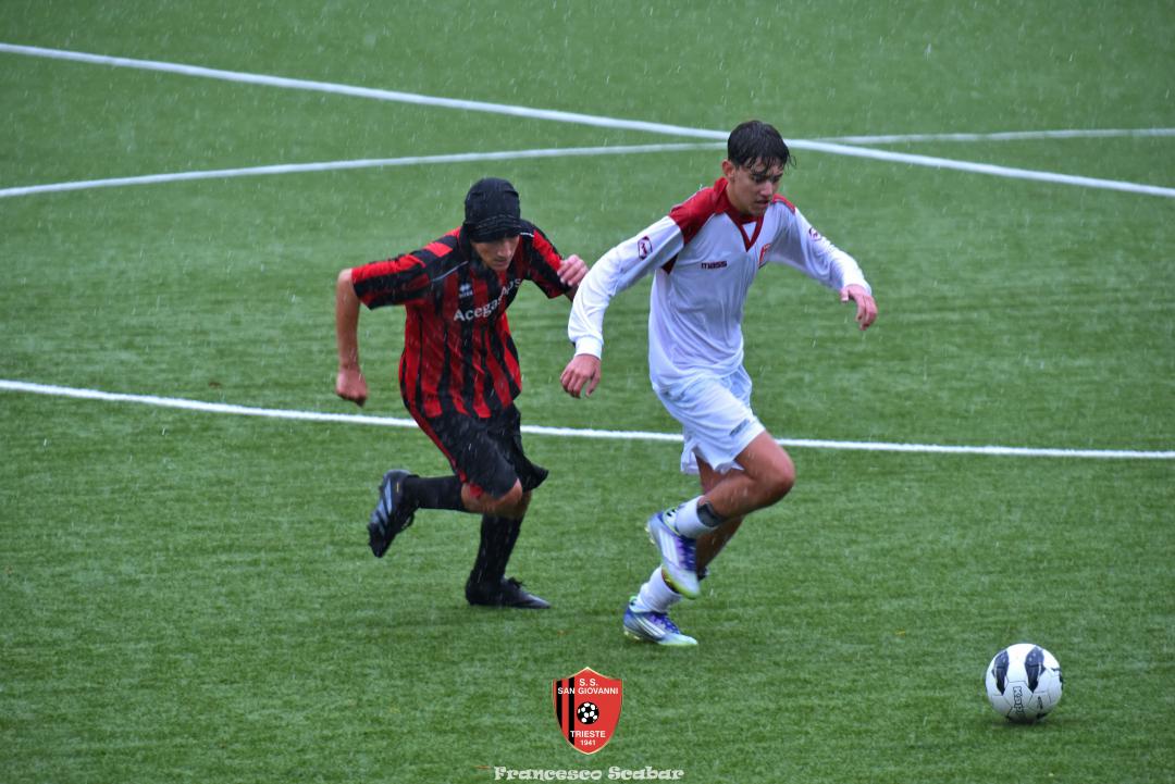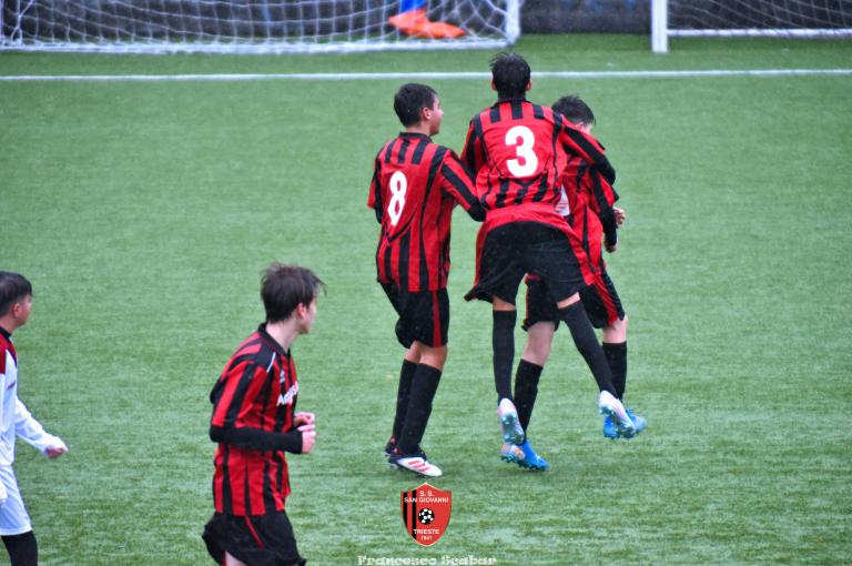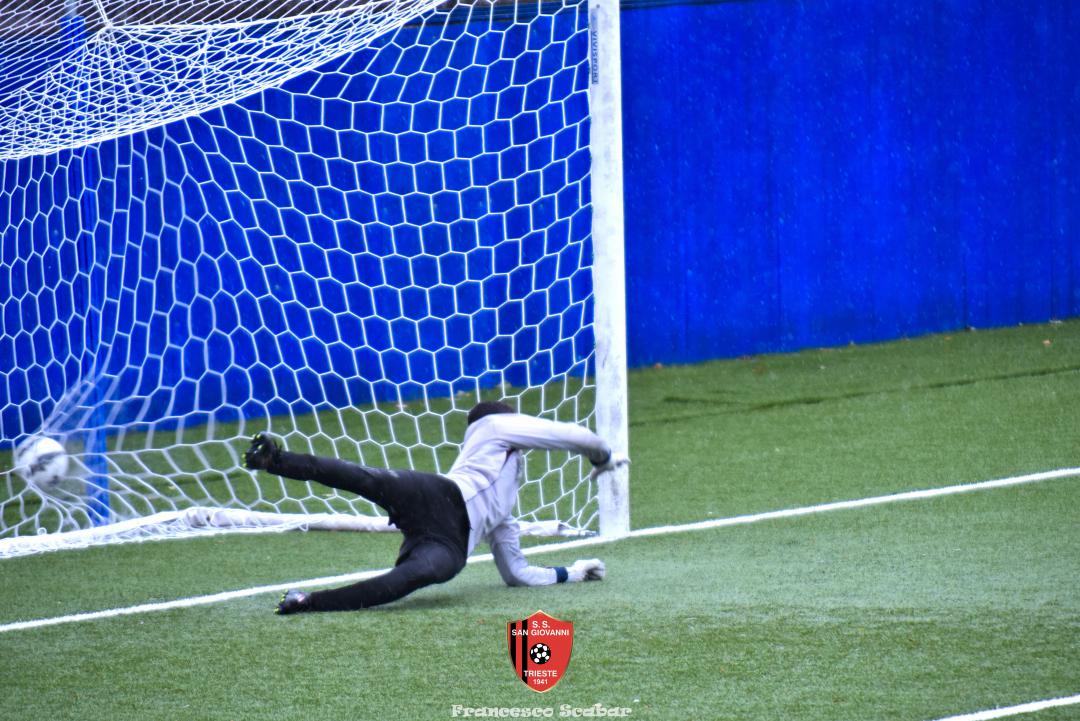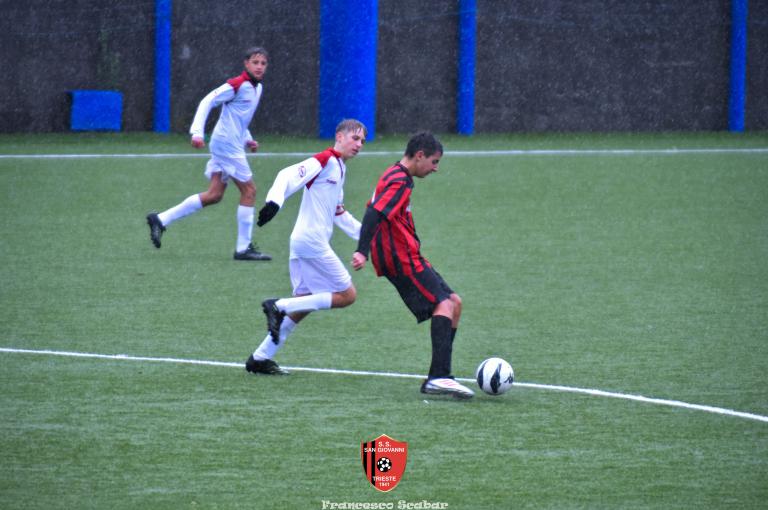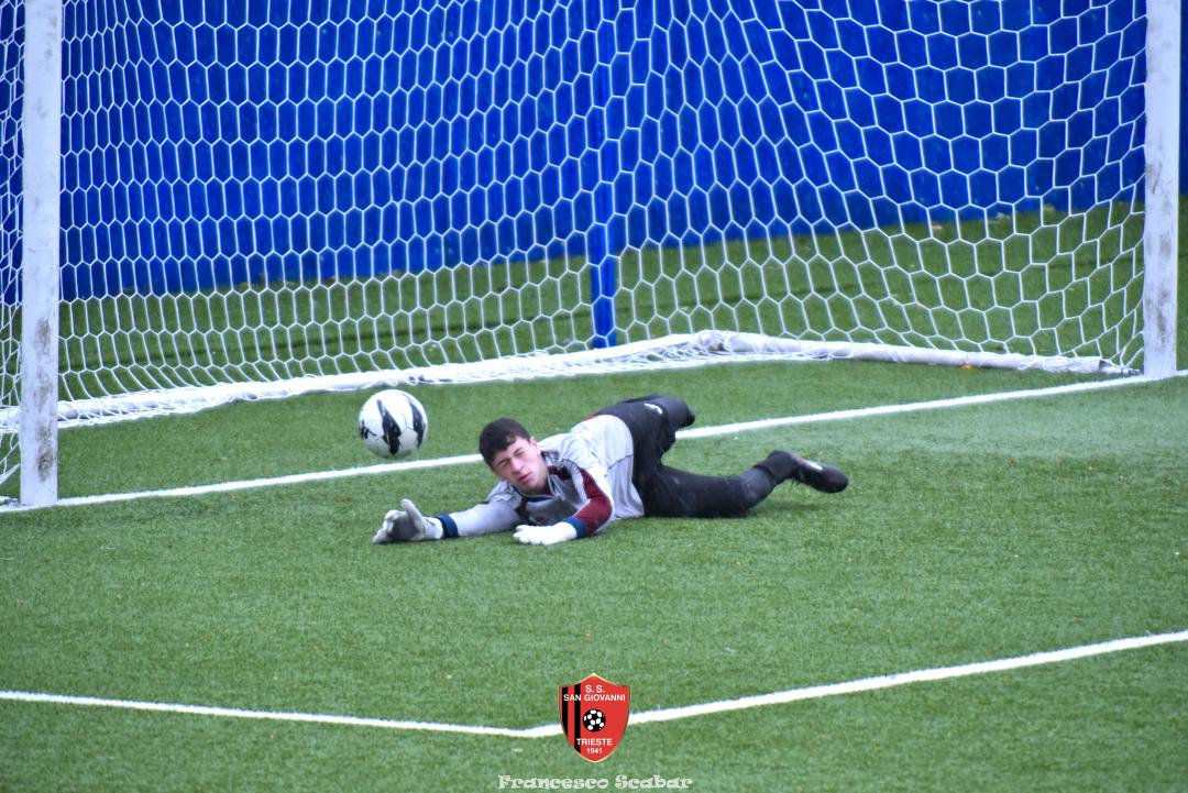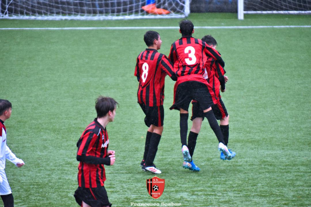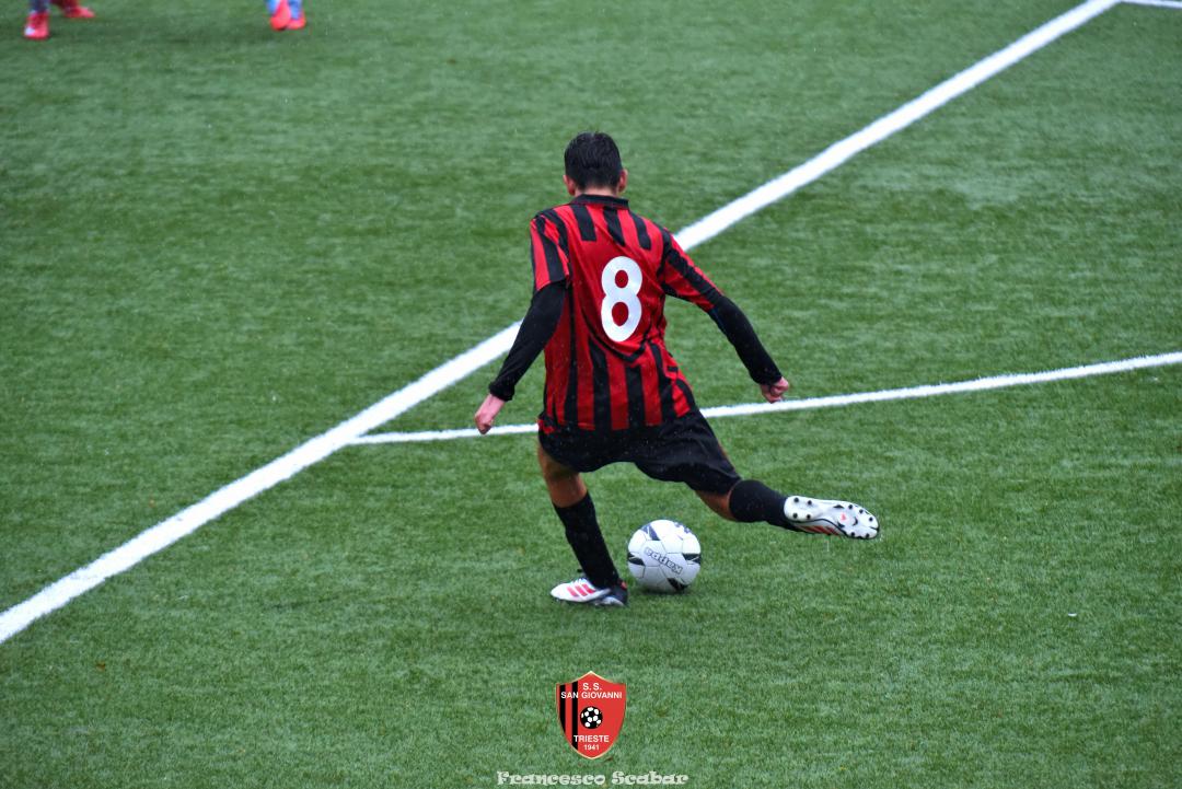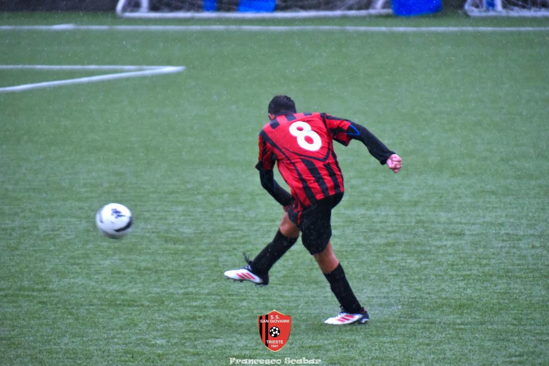 I primi minuti della partita vedono lo Zarja subito pericoloso con un insidioso tiro da fuori area che la traversa rimette in gioco sui piedi di un giocatore carsolino ma è abile il portiere rossonero Rodà a negare il gol del vantaggio agli avversari. Ma al nono minuto è il San Giovanni a far festa: sugli sviluppi di una punizione insidiosa calciata da Morelli, Righi riesce a sfruttare la respinta del portiere dello Zarja Coloni e regala la gioia del momentaneo vantaggio. La reazione dello Zarja arriva però presto ed i carsolini pareggiano con Koren sugli sviluppi di un calcio d'angolo che trova impreparata la difesa rossonera. Poi è più Zarja che Sangio con la squadra biancorossa che sfiora a più ripresa il gol del due a zero.